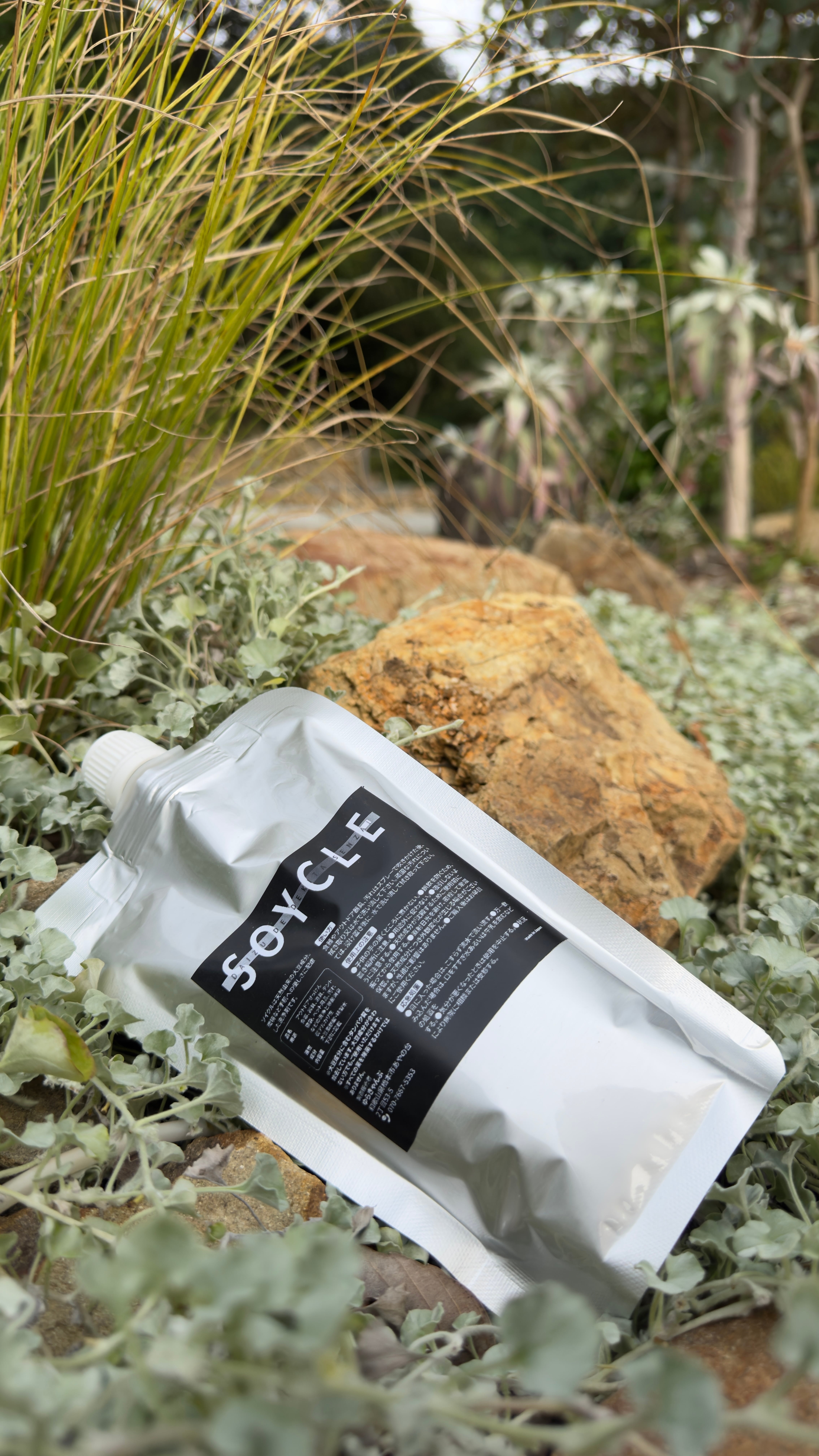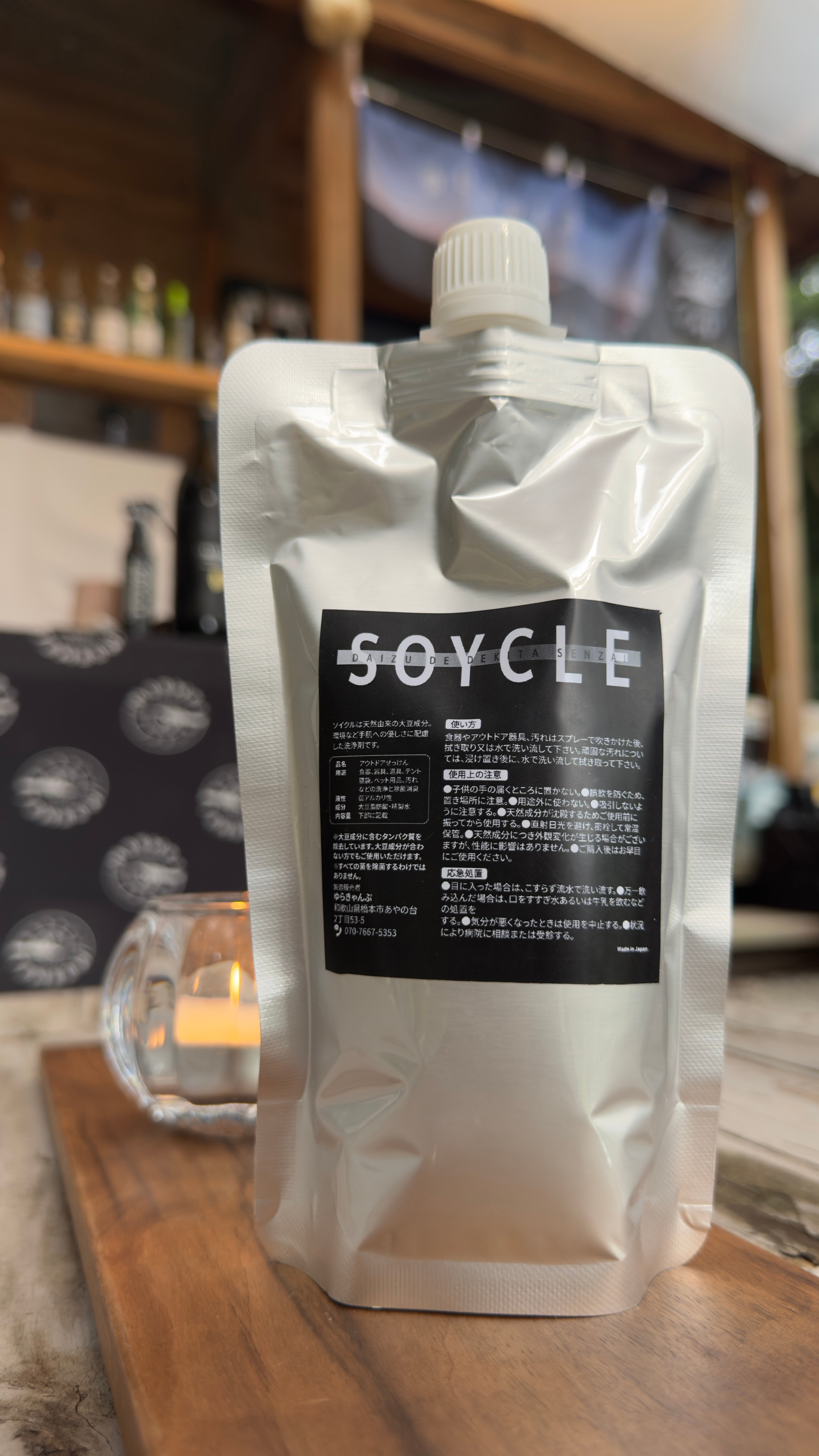 SOYCLE(ソイクル)は大豆から生まれた天然由来の洗浄剤です。すぐれた洗浄力・抗菌力、そして安全性が特長。使用後は水をキレイにして、自然に分解・還元されます。自然を汚さず、水道のないゆらきゃんぷのような環境でも手軽に使えるためアウトドアでの使用にぴったりです。